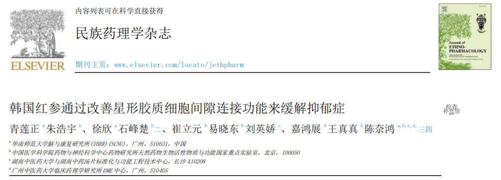②2021年,民族药理学杂志《韩国红参通过改善星形胶质细胞间隙连接功能来缓解抑郁症》;