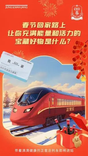 正官庄作为滋补行业的龙头品牌,聚焦人本身,展现出浓厚的人文关怀的温暖底色。不仅实力宠粉,尽可能满足粉丝提出的需求,与粉丝形成双向奔赴;更是将目光投注在春运归家与父母亲友团聚的游子们身上。一则“正在回家中”CG视频,呼吁大家新年带着红参厚礼,踏上回家的列车,正官庄「参情号」高铁活力“大变身”!满载新春能量,奔赴过年团圆归家路!